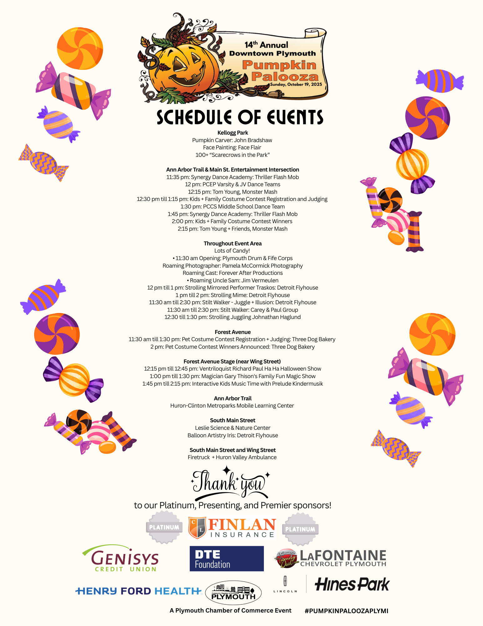 The Plymouth Community Chamber of Commerce also invites you to explore how your business/organization can support Pumpkin Palooza 2025, attracting 8,000 - 12,000 attendees, by reviewing our Sponsorship Packages via the link and information below.
