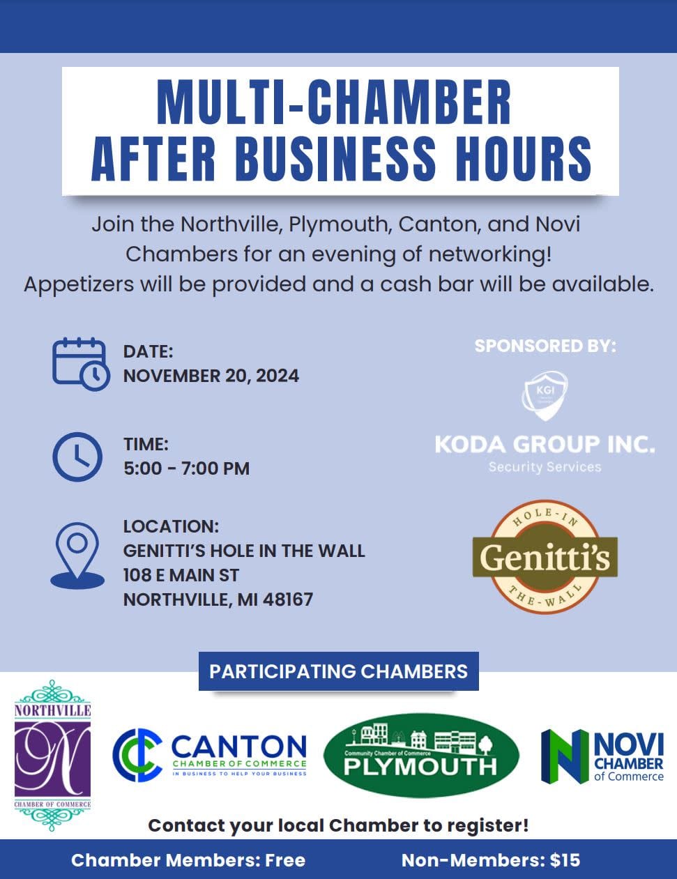 It is always a good time at Genitti's in Downtown Northville! Join us as we partner with the Northville, Novi, and Canton Chambers of Commerce for an After Hours at Genitti's of Northville. Enjoy a great evening networking with our neighboring Chambers. Appetizers and a cash bar will be available.